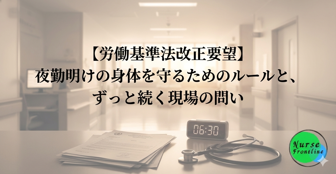 - 背景と現在地:今の医療現場には、夜勤・交代制勤務特有の疲労が、誰にも気づかれないまま静かに降り積もっています。日本看護協会は、これを現場の「工夫」で解決するのではなく、国全体のルールである「労働基準法」そのものを書き換えることで解決しようと動き出しました。