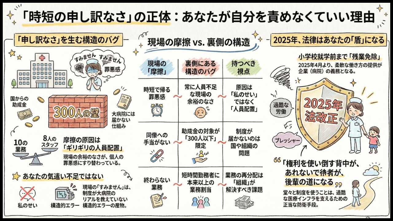 | 時短で帰る際の強烈な罪悪感 | 10の業務量に対して、常に8の人員しか配置できない医療現場の余裕のなさ。 | 摩擦の原因は「私の気遣い不足」ではなく、「ギリギリの人員配置」という構造にある。 |